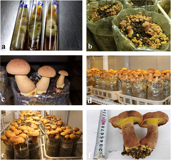 据调查,中华腐生牛肝菌在野外的资源非常稀少,而且产量低,很可能是一种濒危物种。为此,云南省热带作物科学研究所张春霞研究员及其团队根据多年积累的牛肝菌栽培经验,对野生中华腐生牛肝菌进行分离培养,进一步通过液体发酵、栽培菌棒制作、出菇精细化管理,在菇房内首次诱导出中华腐生牛肝菌子实体。在出菇的基础上,牛肝菌团队不断优化母种、液体菌种和栽培基质配方;目前栽培种35 d即可长满菌袋;头茬菇产量达到130 g/袋;一个菌包可采收1~2茬,每茬可以成熟1~5个子实体(图2)。中华腐生牛肝菌菌丝生长速度快、抗杂性强,出菇整齐,产量高,产业化栽培前景广阔。