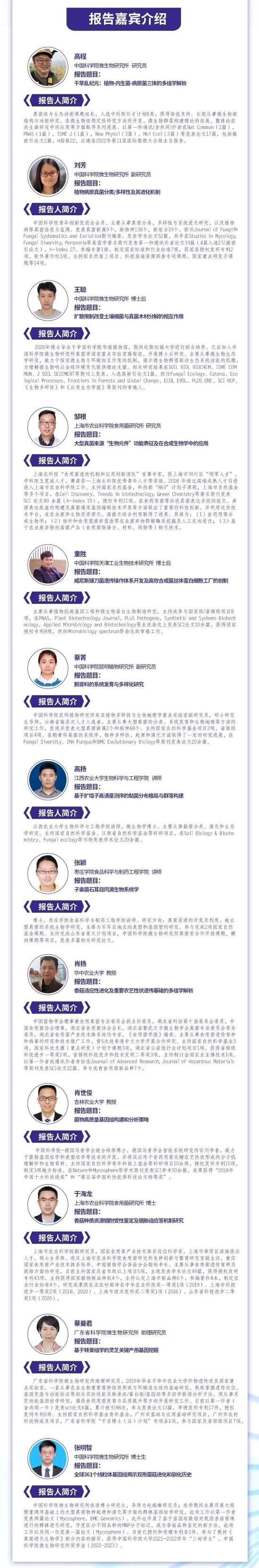 本次会议受到菌物学领域学者广泛关注,组委会收到了来自中国菌物学领域两院院士、中国菌物学会主要负责人和各专业委员会主任推荐的涉及到分子系统学、多组学分析、合成生物学、基因编辑与功能研究、活性物质与代谢调控等多个研究方向的青年学者报告21个,另外安排2个特邀嘉宾主旨报告,有关报告人介绍信息如下: