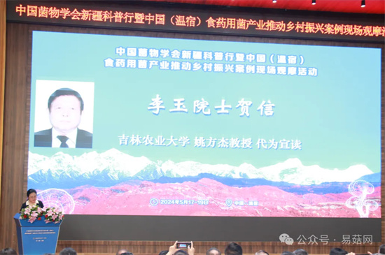 开幕式上,中国菌物学会向温宿国家农业科技园区授予“温宿县菌物产业科普基地”,举办了产业专家聘任仪式以及“桑黄采购”签约仪式。中国菌物学会李玉院士委托团队成员带来贺信。他表示希望通过此次活动,能够支持援疆工作,为食用菌产业发展繁荣和地方经济贡献自己的力量。
