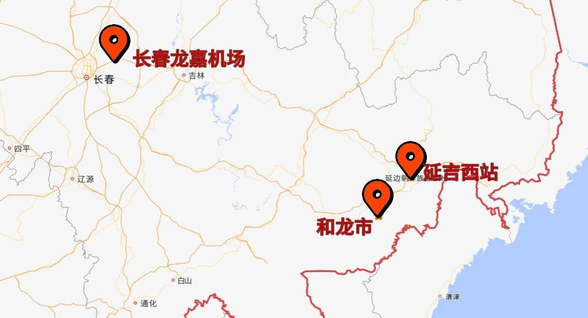 抵达长春龙嘉机场后,在行李转盘拿完行李,抬头就可以看到“火车”标识,跟着走一会看到去负一楼的扶梯,下扶梯后继续跟着“高铁站”标识走,走20分钟左右到龙嘉高铁站。注意:1.进高铁站要正常安检行李。2.延吉西站-和龙宾馆自驾走高速需50分钟左右,花费14元起;打车150元起。