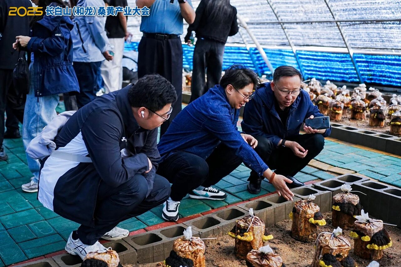大棚内,参会代表清晰看到不同生长年限的桑黄特征:紧贴栽培带、颜色深近黑色的是一年生桑黄,向外延展的深褐色部分为二年生,最外层金色部分则是三年生。“经过 3 年生长,菌包内有效成分基本消耗完毕,此时采收的桑黄从经济效益、营养价值来看都是最佳状态!” 负责人的讲解让参会代表对桑黄生长周期有了直观认知。
