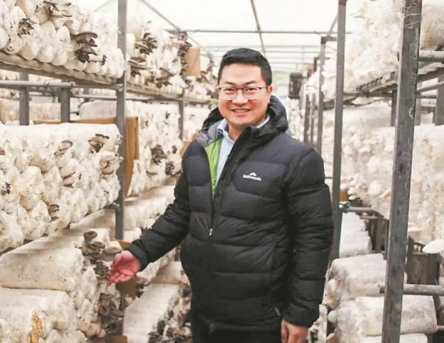 吴耀民在农场里查看蘑菇长势。(受访者供图)