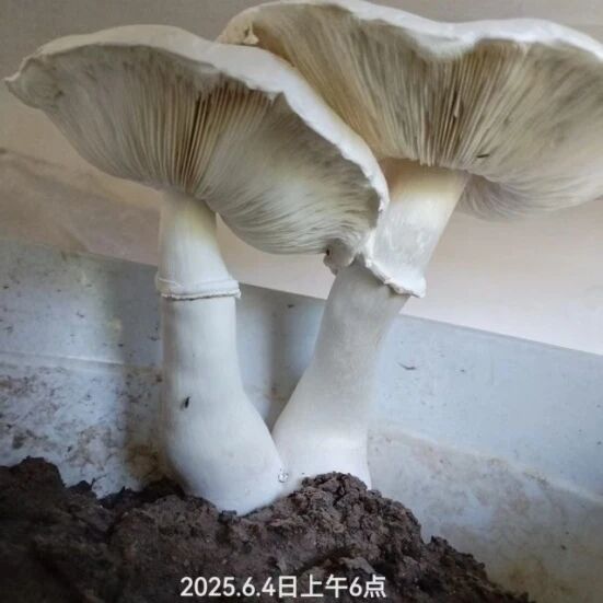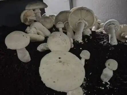 随后的扩大栽培实验成果喜人,同年11月,在仅0.5平方米的栽培面积上,第一潮菇便采摘到5.4斤鲜菇(图6-7)。其个大,菇柄粗壮,高度可达25厘米,菌肉肥厚。现场采摘烹饪品尝,味道鲜美,菇盖滑腻感,菇柄口感口味类似于本地杨树口蘑。