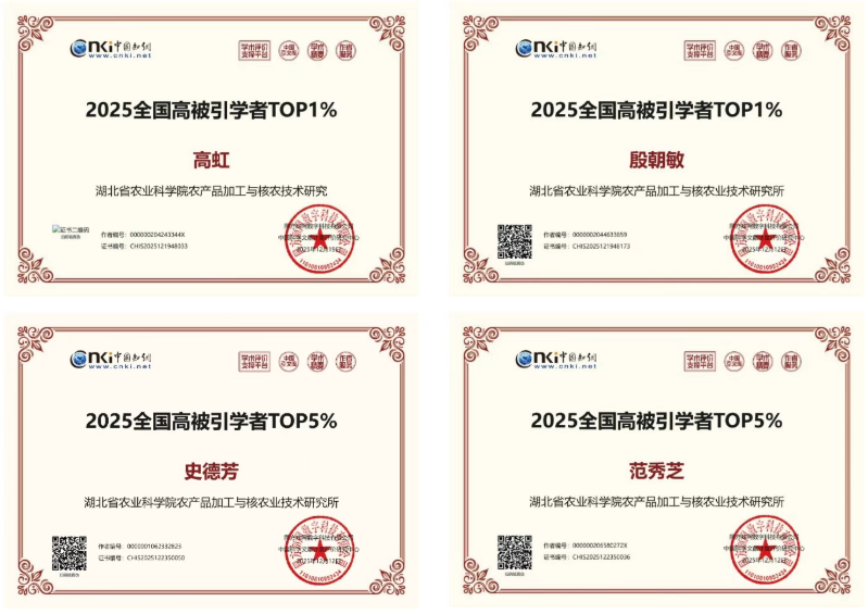 近日,中国知网发布 “2025全国高被引学者”名单,湖北省农科院食用菌加工团队高虹研究员、殷朝敏副研究员入选TOP1%高被引学者榜单,史德芳研究员、范秀芝副研究员入选TOP5%高被引学者榜单,充分展示了该团队在国内食用菌保鲜加工领域的学术影响力。