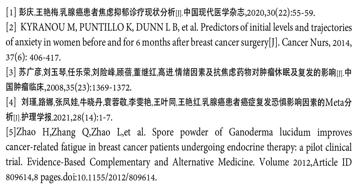 临床试验结果指出,菌物药灵芝制剂可帮助改善接受内分泌等治疗的乳腺癌患者癌相关性疲劳,减轻患者的焦虑、抑郁程度,提高生活质量。