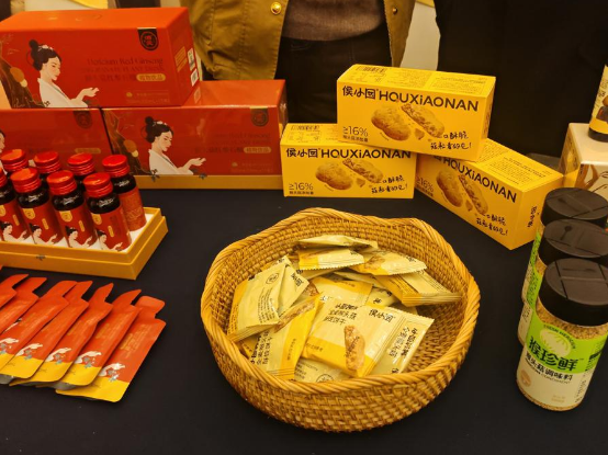 展台上的猴头菇脆片、猴头菇红参饮品等新产品(金奕伶 / 摄)