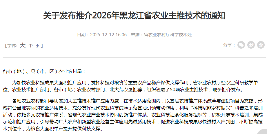 为加快农业科技成果大面积推广应用,发挥科技对粮食等重要农产品稳产保供支撑作用,黑龙江省农业农村厅经农业科研教学单位、农业技术推广部门、各市(地)农业农村部门、北大荒农垦推荐,组织遴选了50项农业主推技术,近日进行发布。“黑木耳菌渣二次出菇技术集成与示范”入选主推技术。