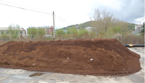 菌渣发酵:按照配方的比例准备材料,充分混匀后,将混合物堆成梯形堆,在材料堆上垂直打两排直径为5厘米、间距为50厘米的气孔。当温度高于60°C(堆顶以下20厘米)时,保持24小时以上。重新混合堆料并重新堆成梯形堆料,这一步骤的目的是排出有害气体,补充新鲜空气,使发酵过程更加成功。一般情况下,在整个发酵过程中需重新堆4次。第一次复堆后,再次复堆的间隔为6、5、4天,整个发酵过程应持续20-25天。发酵完全的培养基无氨味、无粪臭味道、有弹性、不结块且不粘。最后,向基质中加入1%的石膏,用石灰将基质的pH调节至7.0-7.5,将最终混合物的含水量调节至55-65%(w/w)。