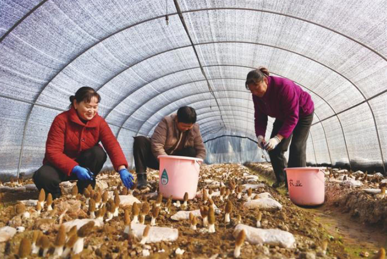 在鸣凤镇花园村羊肚菌种植基地内,工人们正在收割头批成熟羊肚菌。 三峡日报记者 曾雪彬 摄