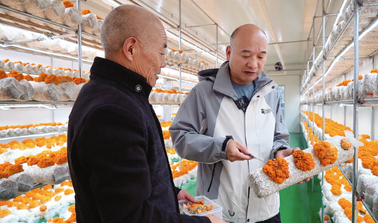 1月15日,在柞水县山城美农生态农业科技有限公司的金耳种植区里,企业负责人陈盛林(右)检查金耳生长情况。 (本报通讯员 李沁杰 摄)