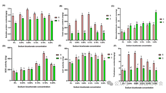 图2 耐盐菌株H2(R)与盐敏感菌株H26(S)在不同碳酸氢钠浓度下的生理指标变化(p<0.05)
