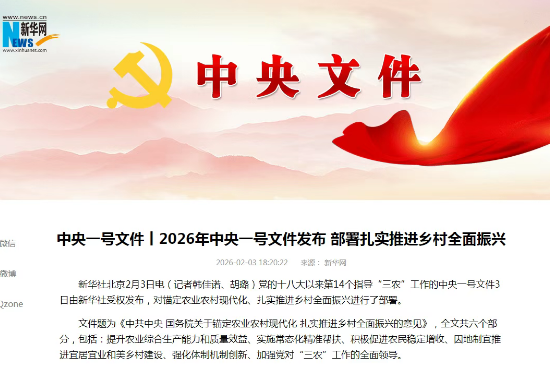 2026年2月3日,“十五五”时期的第一个中央一号文件——《中共中央 国务院关于锚定农业农村现代化 扎实推进乡村全面振兴的意见》正式发布,为全面推进乡村振兴擘画了新蓝图。