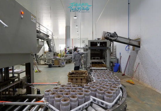 生产基地内,400余名工人各司其职,洗瓶、杀菌消毒、菌瓶培育、鲜菇采收等工序紧密衔接。得益于智能化生产流程的优化,黑牛肝菌从菌种培育到出菇采摘的周期被精准控制在45天。
