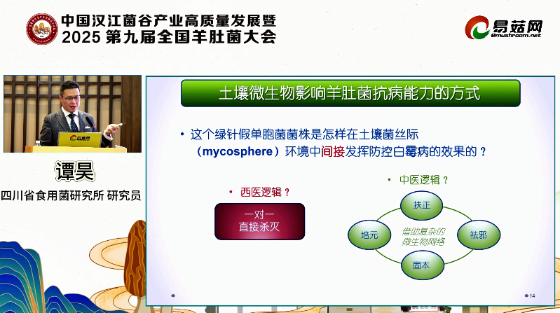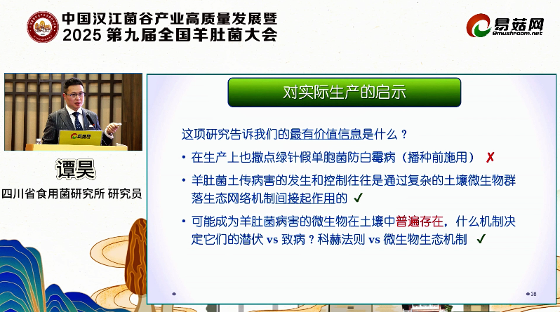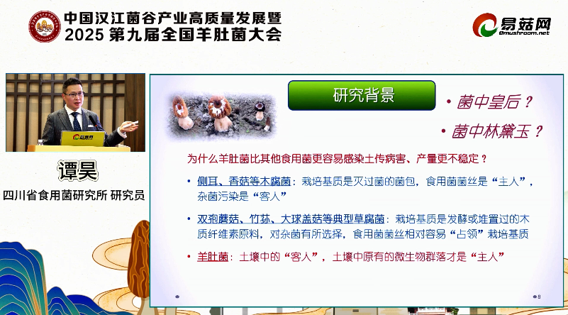 【核心提示】:本文报道了四川省食用菌研究所谭昊研究员关于"基于土壤微生物生态原理的羊肚菌白霉病绿色防控研究"的报告。报告聚焦羊肚菌覆土栽培中白霉病这一头号威胁,指出羊肚菌因以纯土壤为出菇床、生态位竞争力弱而极易受土壤微生物群落影响。谭昊团队提出调控真菌菌丝际微生物组的防控思路,通过施用绿针假单胞菌活菌显著降低白霉病发病率并提升产量,但强调核心价值在于揭示病害防控依赖复杂微生物生态网络,而非单一菌剂。建议通过选择贫有机质土壤、理性施用有机肥、强化新品种选育实现病害防控,为羊肚菌产业可持续发展提供理论支