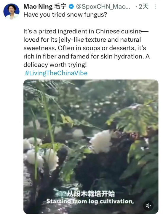 2月26日,外交部发言人毛宁在海外社交平台向全球推介古田银耳,让这颗深山里的“银花”以国家名片之名,走进国际视野。