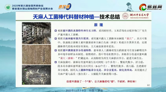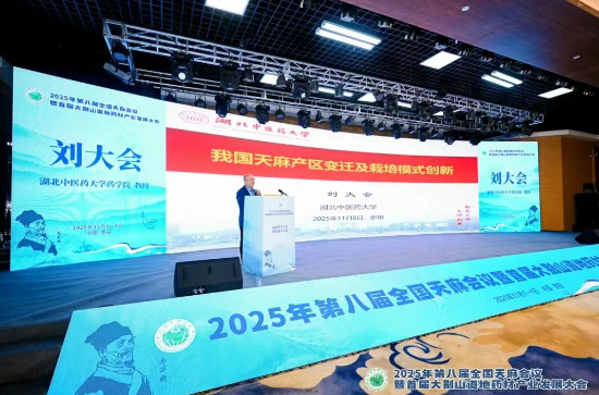 【核心提示】:本文报道了在"2025年第八届全国天麻会议暨首届大别山道地药材产业发展大会"上,湖北中医药大学刘大会教授关于"我国天麻产区变迁及栽培模式创新"的报告内容。报告系统梳理了天麻从秦汉至今两千余年的产区变迁史(从黄河流域逐步西迁南移至五大产区),指出野生资源因过度采挖已濒危的现状。重点介绍了具有突破意义的天麻人工菌棒代料种植技术,该技术以农业废弃物为主料工厂化生产蜜环菌菌棒,替代传统砍伐林木制备菌材的模式,解决了"菌林矛盾",实现亩产鲜麻3000公斤以