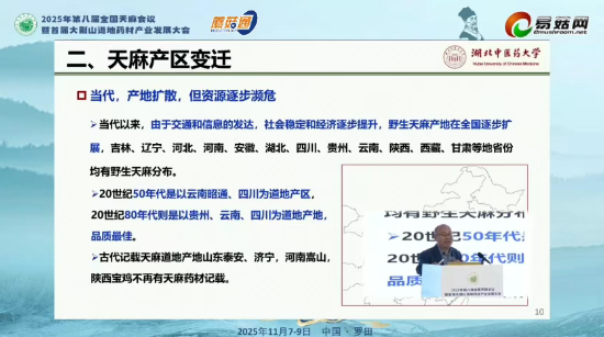 在“2025年第八届全国天麻会议暨首届大别山道地药材产业发展大会”上,湖北中医药大学教授刘大会作了题为“我国天麻产区变迁及栽培模式创新”的报告,系统梳理了天麻在我国长达两千余年的产区变迁史、栽培产区、栽培模式,并重点介绍了具有突破意义的天麻人工菌棒代料种植技术。