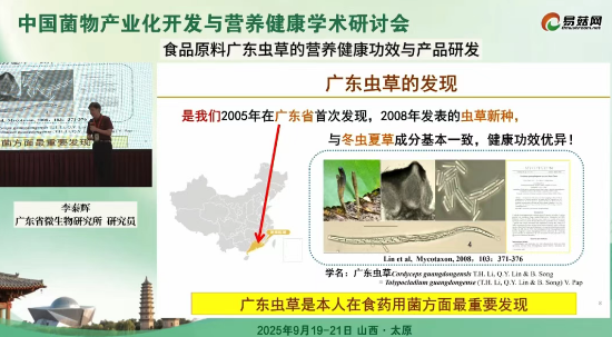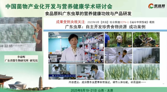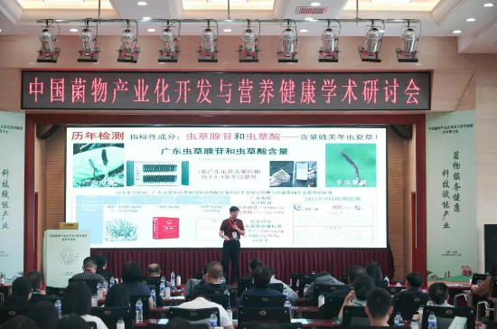 在中国菌物产业化开发与营养健康学术研讨会上,广东省科学院微生物研究所首席专家李泰辉研究员作“食品原料广东虫草的营养健康功效与产品研发”报告,系统介绍了广东虫草的发现历程、营养成分、安全性评价、健康功效研究及产品开发现状。